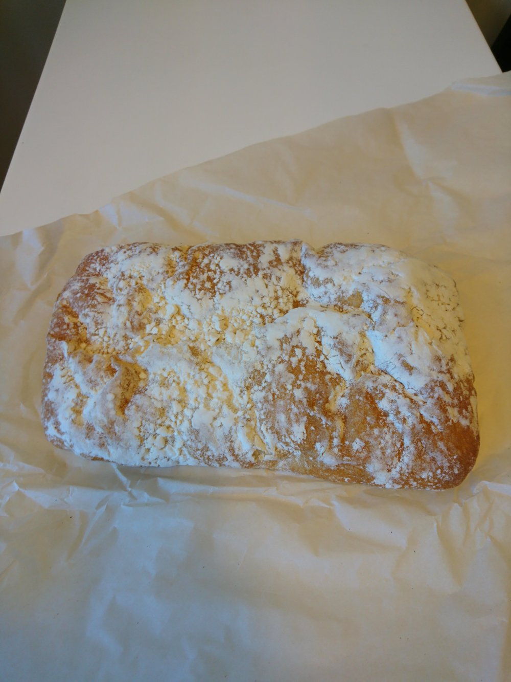 Por fin hemos encontrado un pan que nosotros encontramos rico 😋 Aqui lo llaman Chapata, pero es un pan muy ligero, casi hojaldrado, con un cierto sabor a mantequilla… La verdad es que lo tostamos, y queda una corteza muy muy fina, pero crujiente… y con aceite de oliva parece casi como un desayuno español 🙂