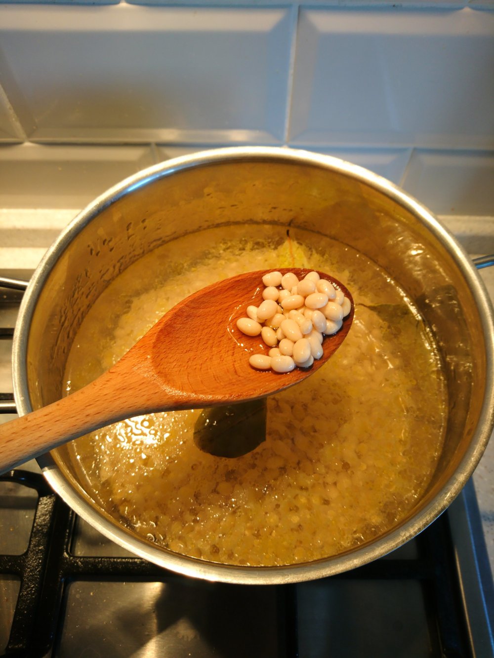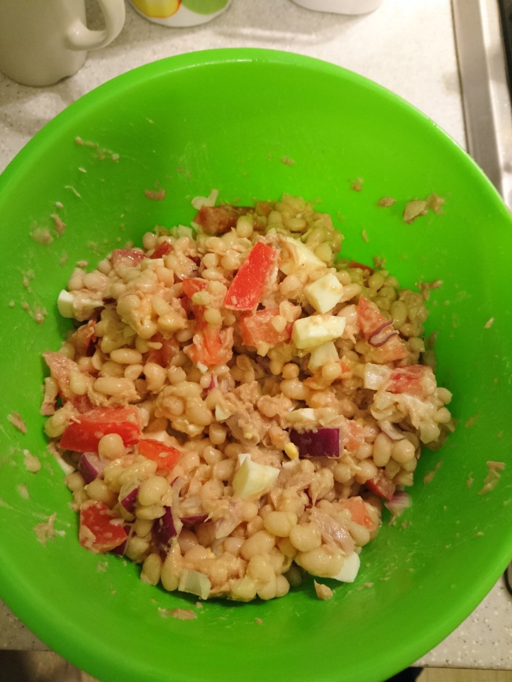 Judias blancas (no soy racista), 2 huevos cocidos, 1 tomate, 1/2 cebolla y atun (en aceite de girasol), aceite oliva y vinagre de vino… otro dia probaremos con sardinas a ver que tal