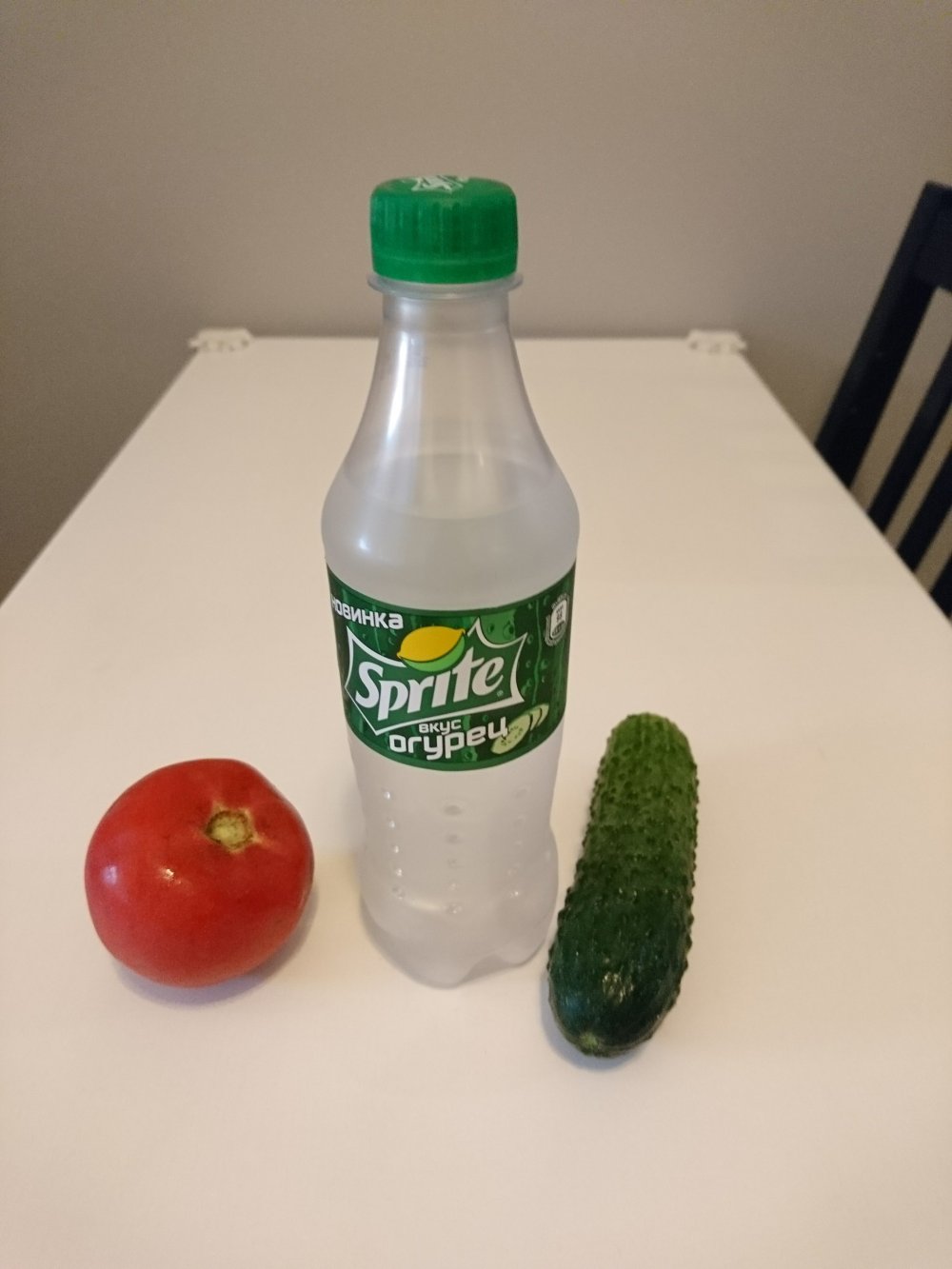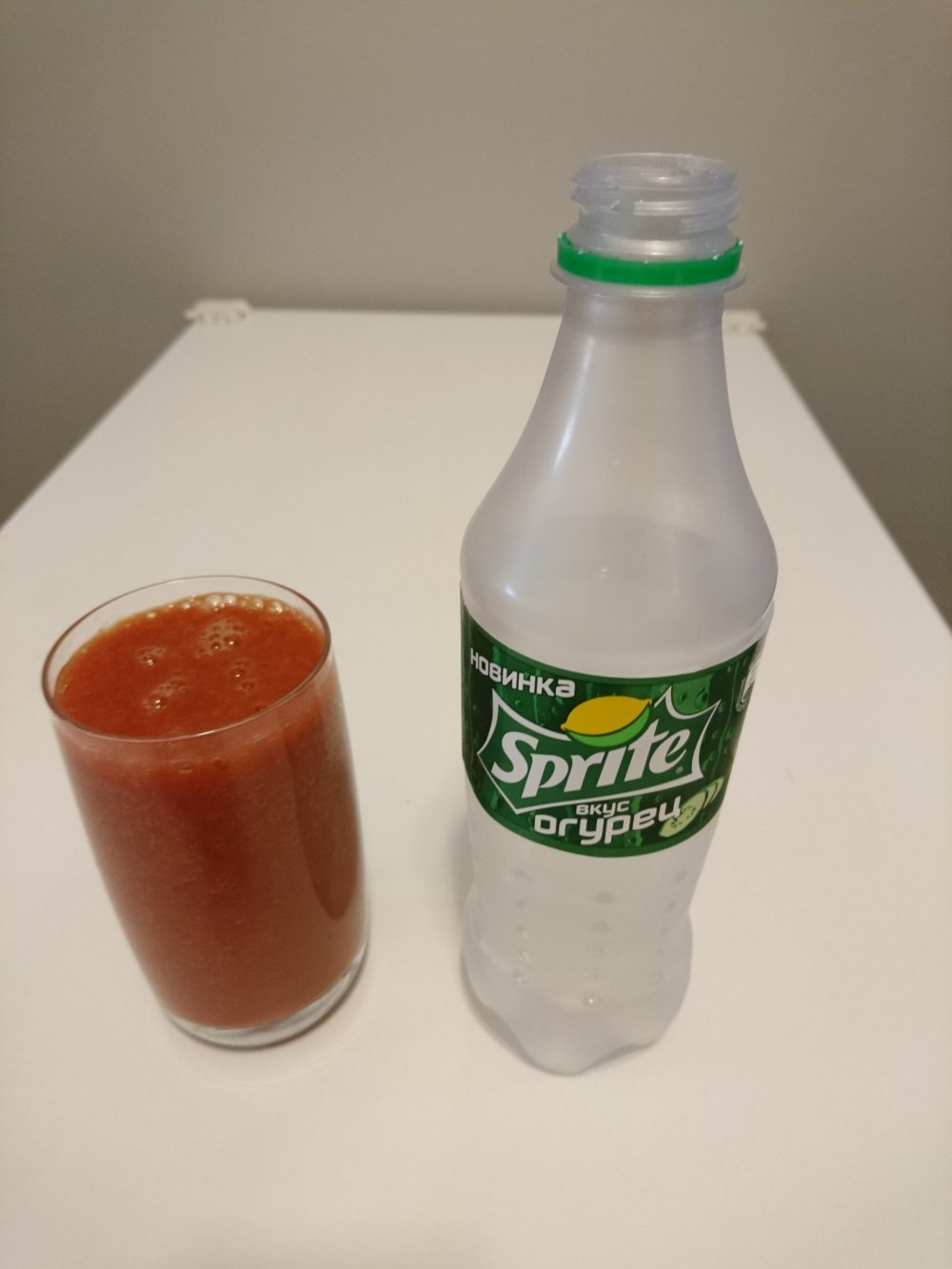 Curiosa «cosa», porque el Sprite sabe a pepino fresco (👍) pero tiene a la vez un saborcillo algo dulce, asi que salio un Gazpacho con burbujas dulce 😀😀😀