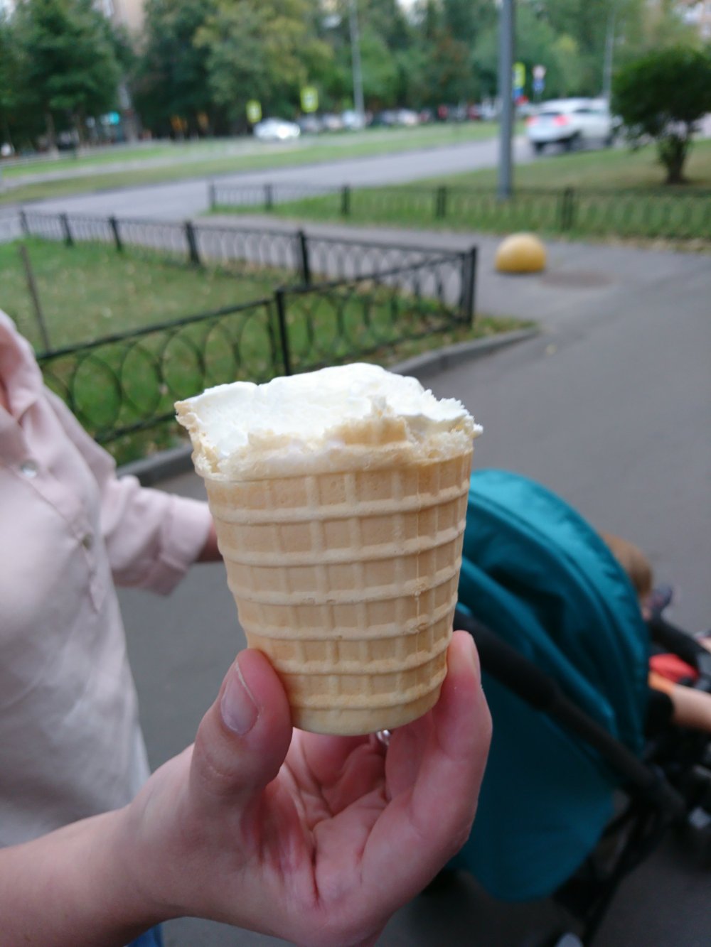 Es otro tipico helado ruso… el otro dia ibamos paseando y nos cruzamos en muy poco espacio de tiempo con 3 o 4 personas comiendo este tipo de helado… como un «cornete» sin piquito…