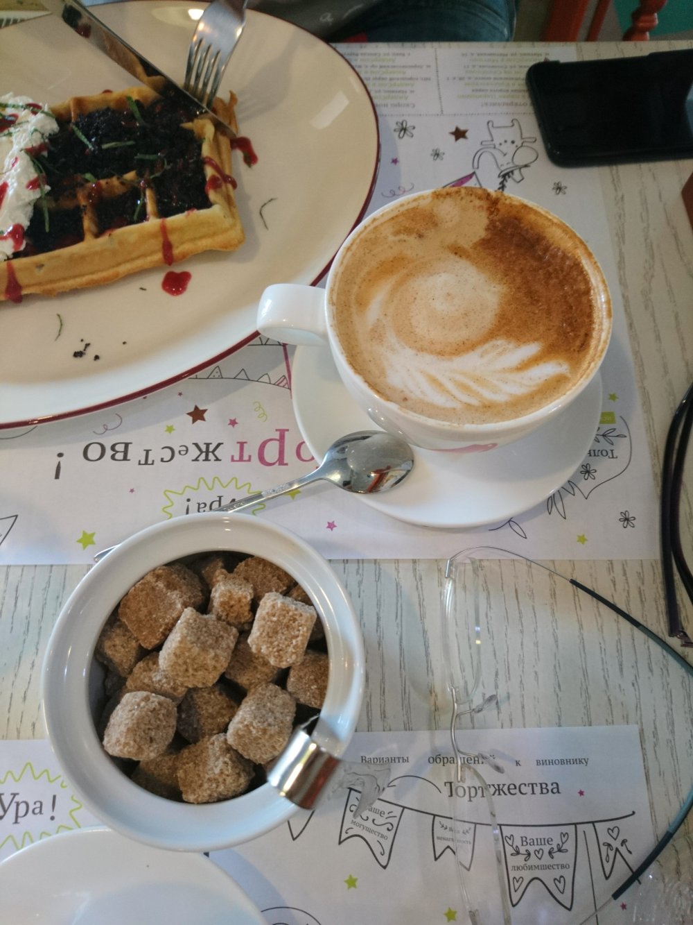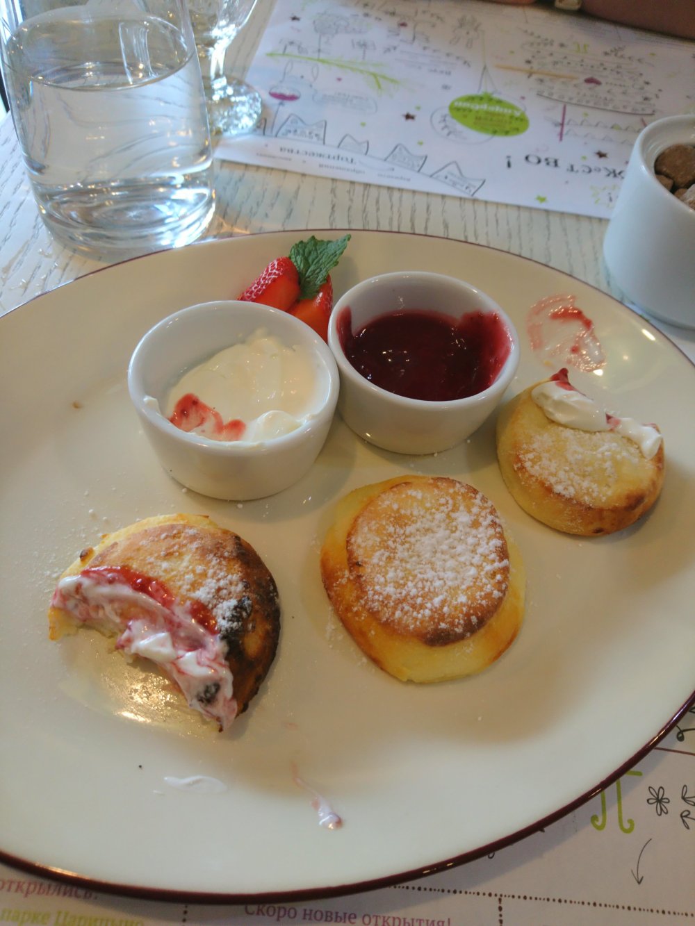 Es una cafeteria para niños, muy simpatica… tomamos un gofre con semillas de amapola (en Rusia es muy popular, y se usa bastante), syrniki (ya lo hicimos una vez en casa, es como una tortita, pero con requeson… esta era como mouse… muy ligera)… y dos Capuchinos… ya sabeis que aqui todo es muy poco dulce…