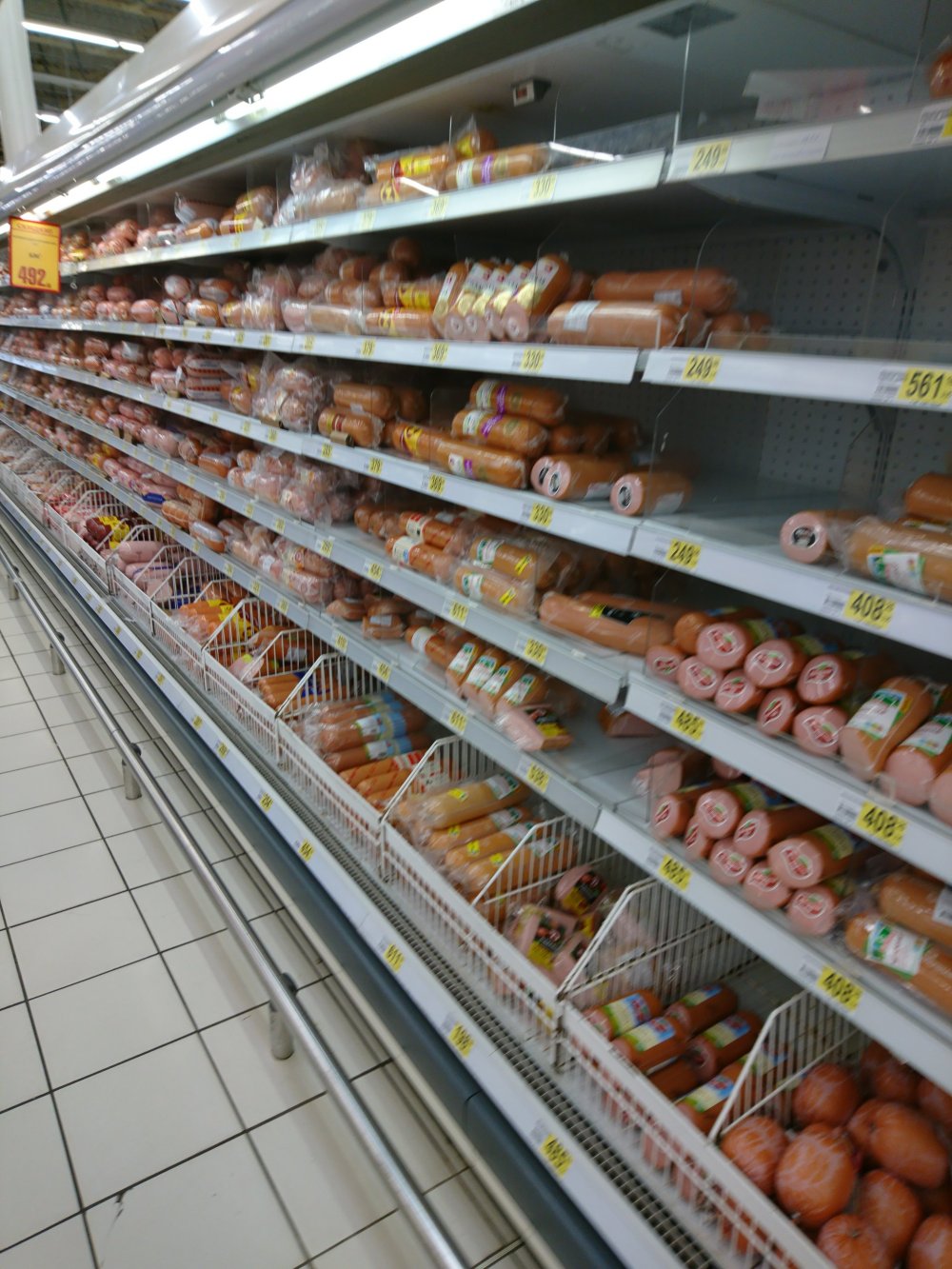 колбаса… Kolbasá… el ruso es un poco como el español, hay una palabra para cada matiz, una palabra para querer decir algo diferente… pero Kolbasá no es asi… Kolbasá es algo generico que lo mismo significa salchicha cocida, salchicha cruda, salchichon ahumado y cocido, salchichon crudo curado, crudo y ahumado, de cerdo, ternera, etc…. y todo esto es muy muy muy popular aqui… de echo podeis ver la cantidad que hay de todo esto…