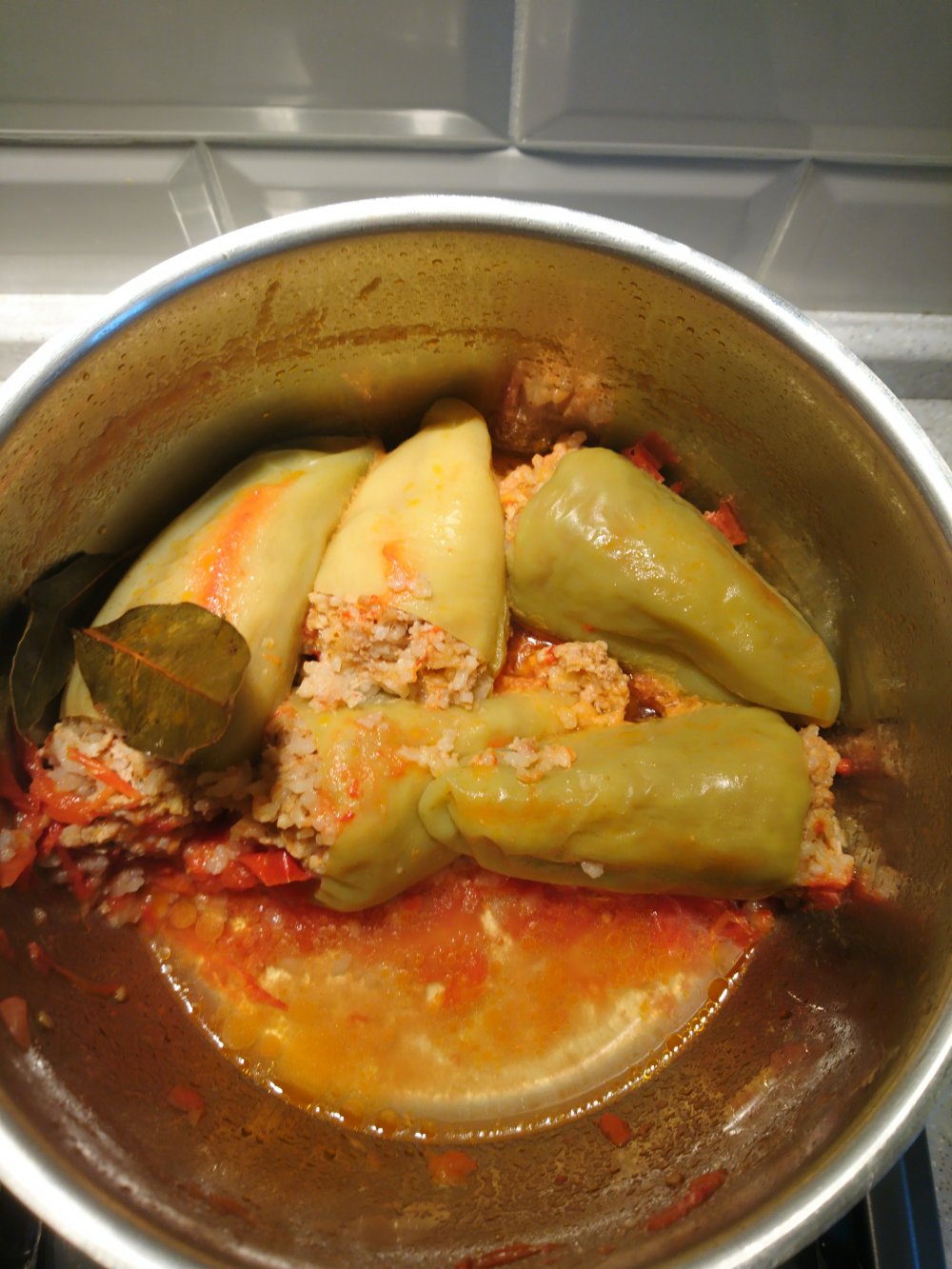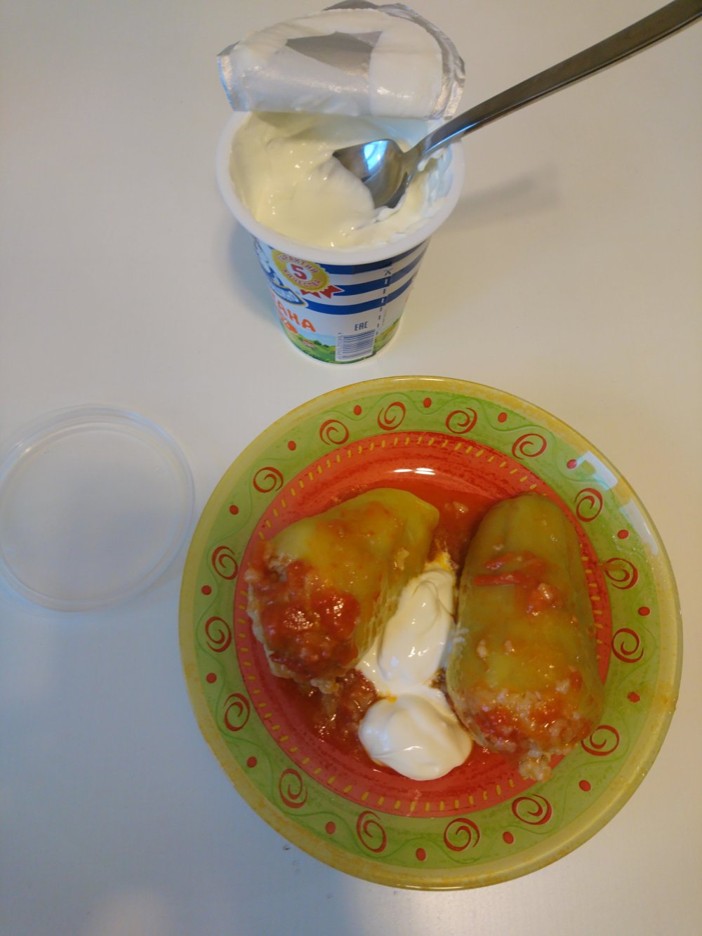 Coges unos pimientos (para hacer esta comida aqui se usan unos pimientos que llaman jovenes, tienen menos carne que los pimientos-pimientos), se limpian y se rellenan de carne picada y arroz, y se dejan cocinar en una salsa de tomate, preferiblemente natural… se comen con unas cucharadas de smetana (en el Alcampo la venden como nata francesa) y ya esta… 😀 😀 😀