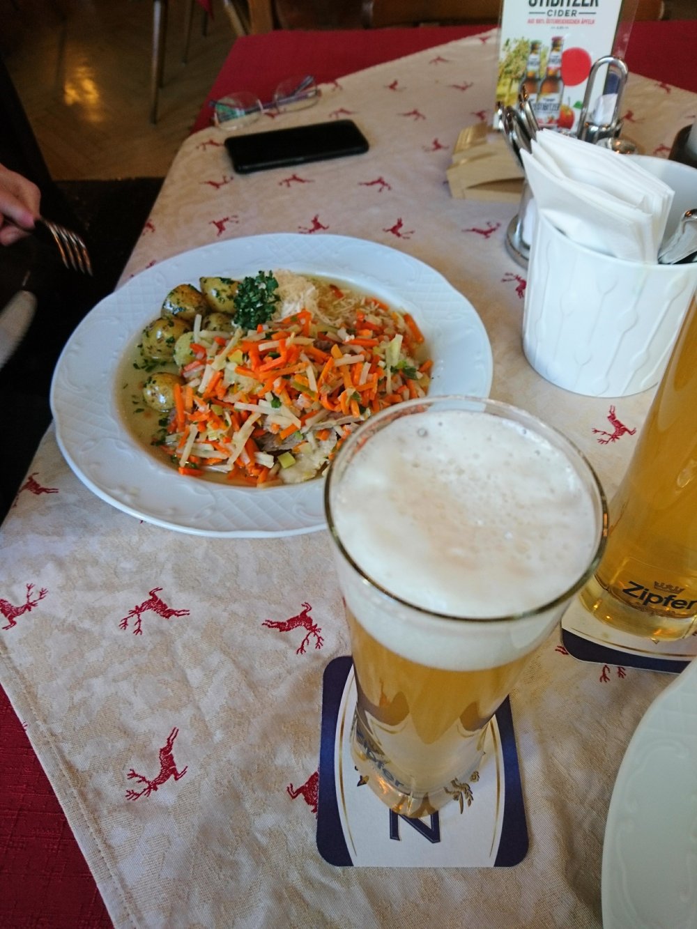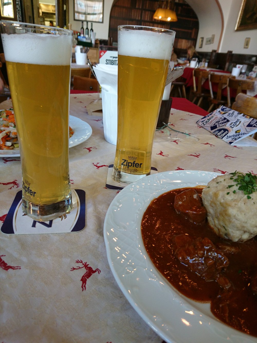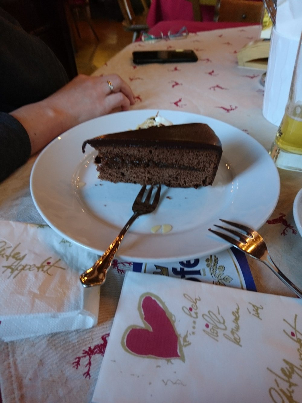 Gulash con bola de miga de pan… 😀 😀 😀 y mezcla de verduras y filete cocido… con su tipica tarta sacher (de aqui vienen nuestras tipicas tartas de chocolate… este es el origen)