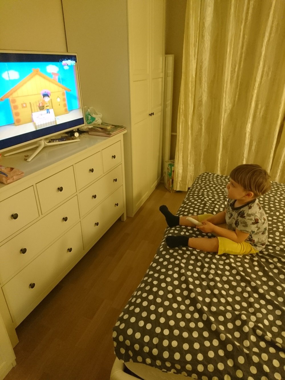 Abro la puerta, enciendo la luz, cojo el «tete», cojo el mando, me siento en la cama, y enciendo la tele… y ya!!! 😀😀😀