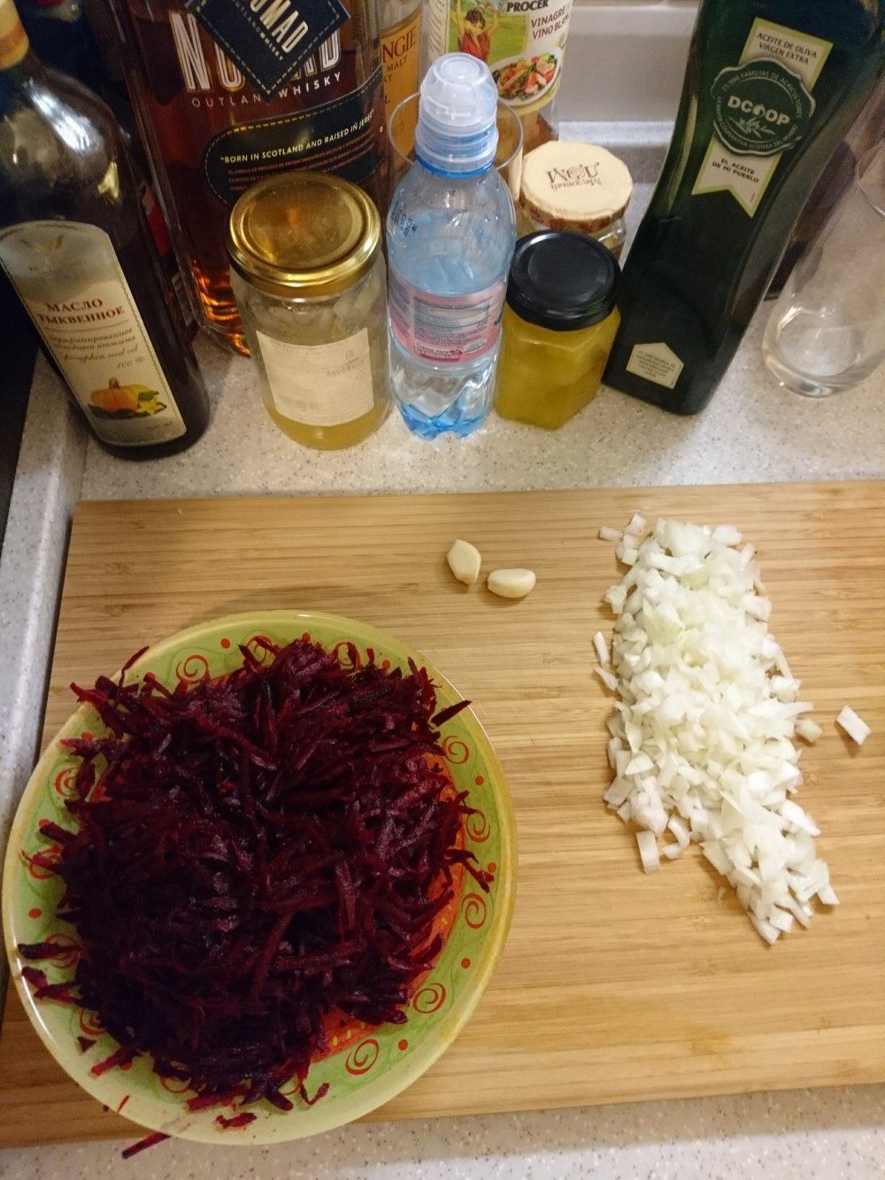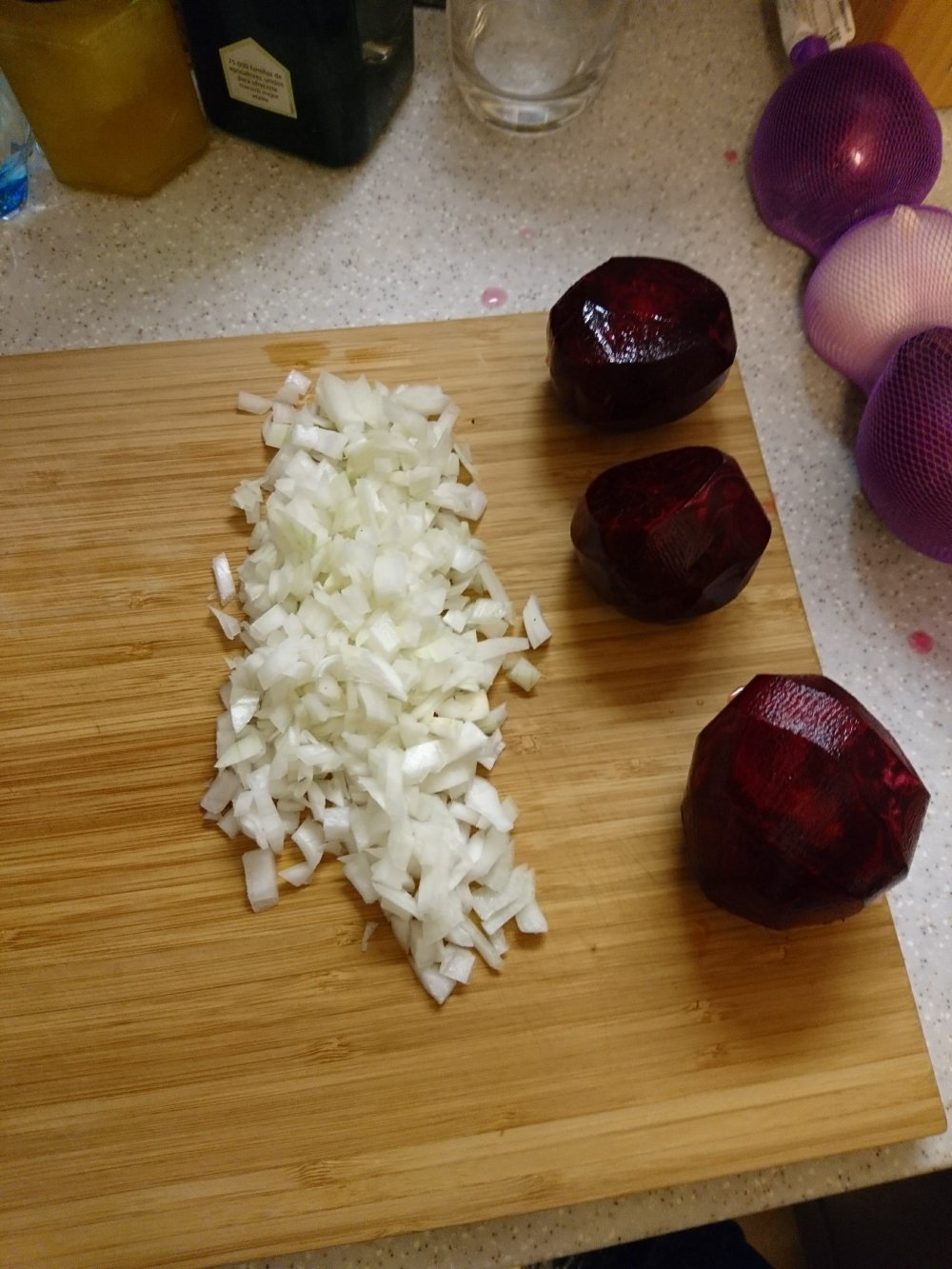 se pone vinagre, como 3 o 4 cucharadas para que la remolacha no se oxide y al echarla en la olla se convierta en marron… y tambien en la olla, la misma cantidad… se rehoga un poco mas y se vierte a la olla…