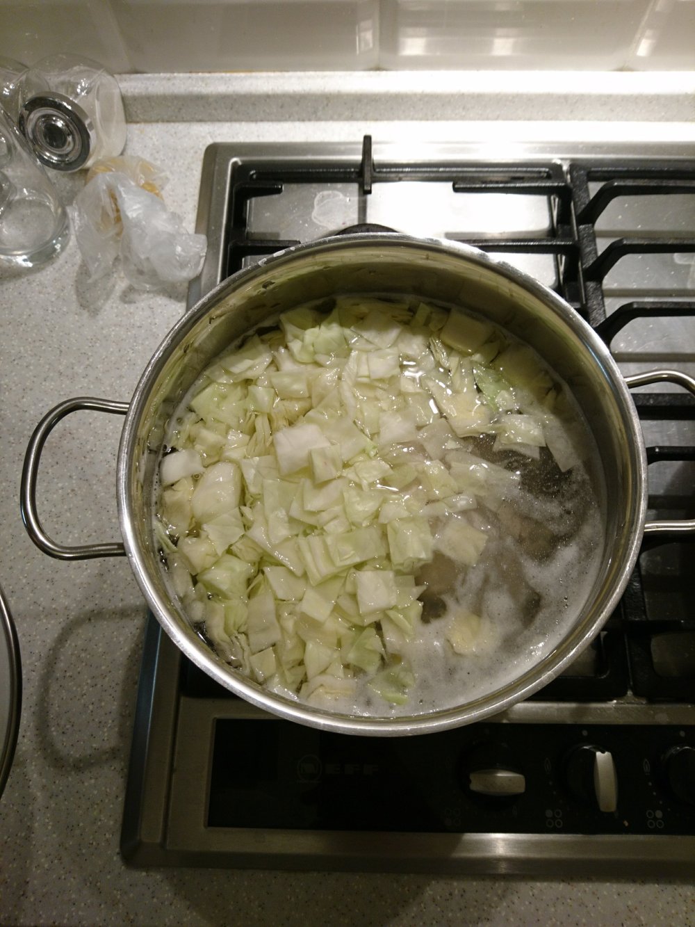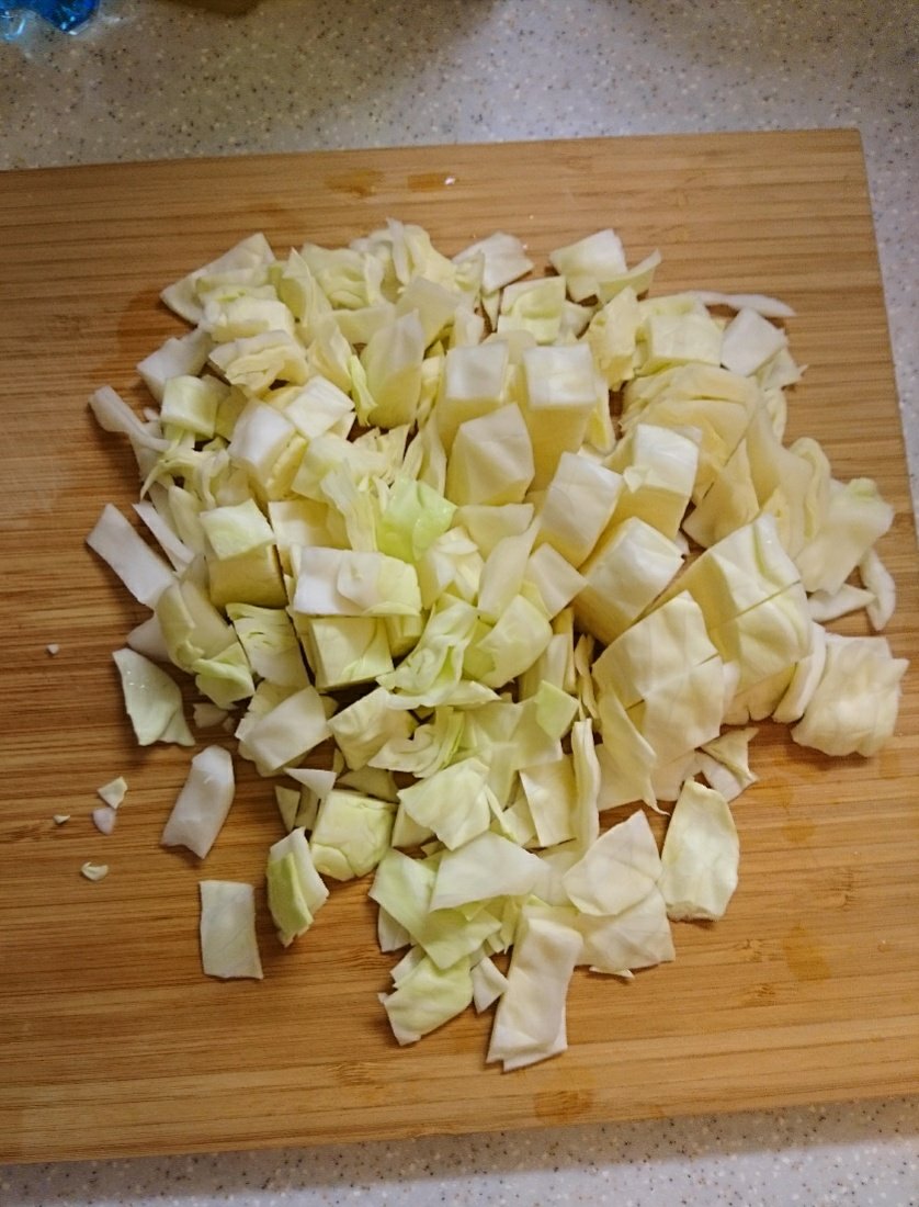 2) Troceamos la Col y la ponemos a cocer, es la verdura mas dura… el repollo es mas blandito…