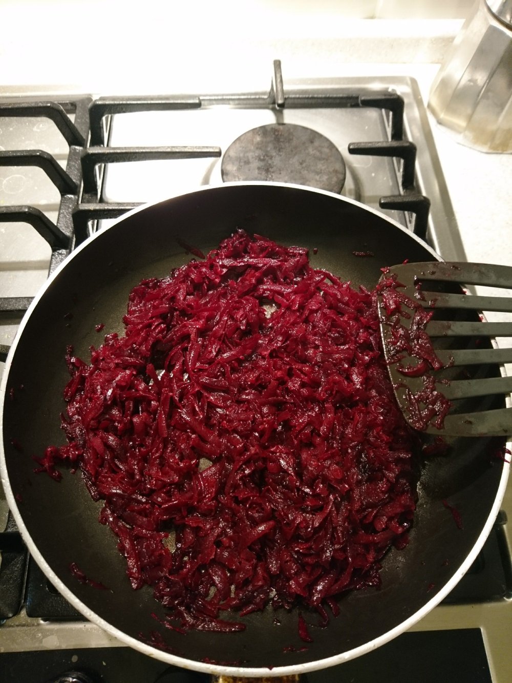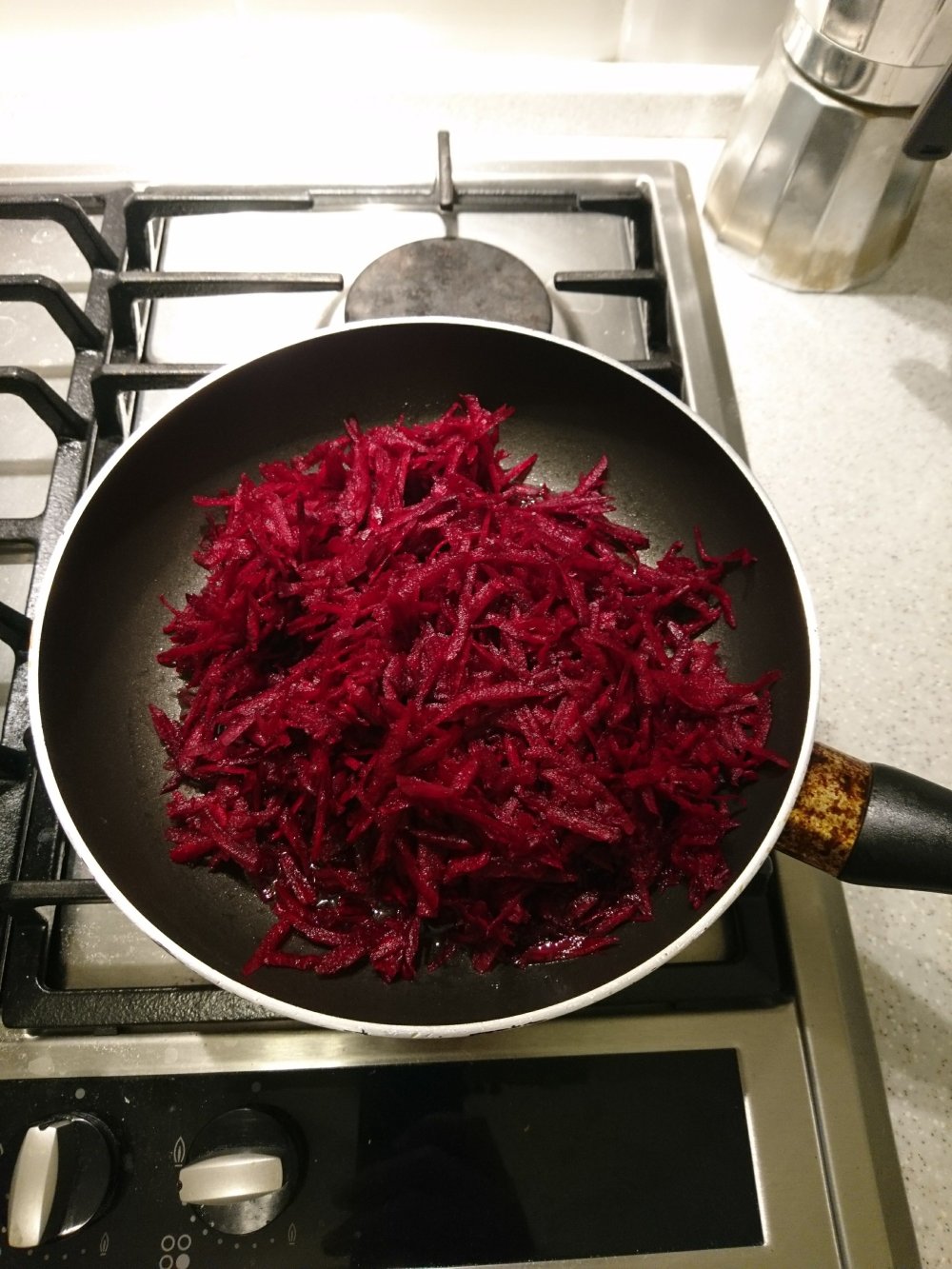 6) Mientras cuece la col y las patatas, ponemos aceite de girasol en la sarten y pochamos y caramelizamos la remolacha, pasara de tener un color rojo claro a rojo oscuro, mas o menos a fuego bajito como 15 min.