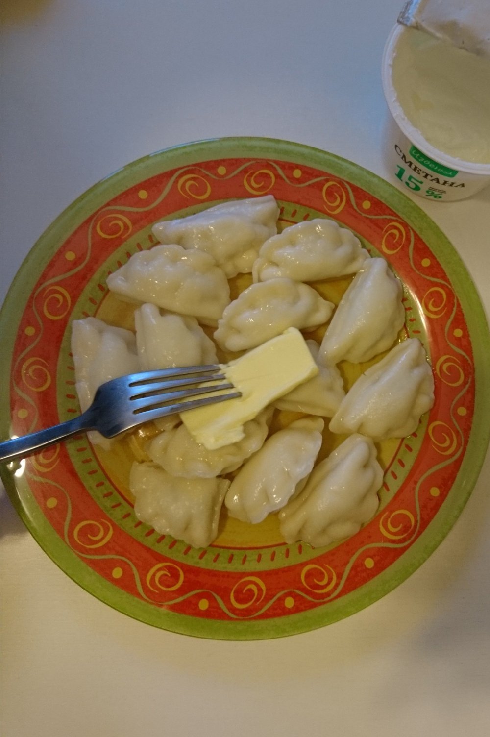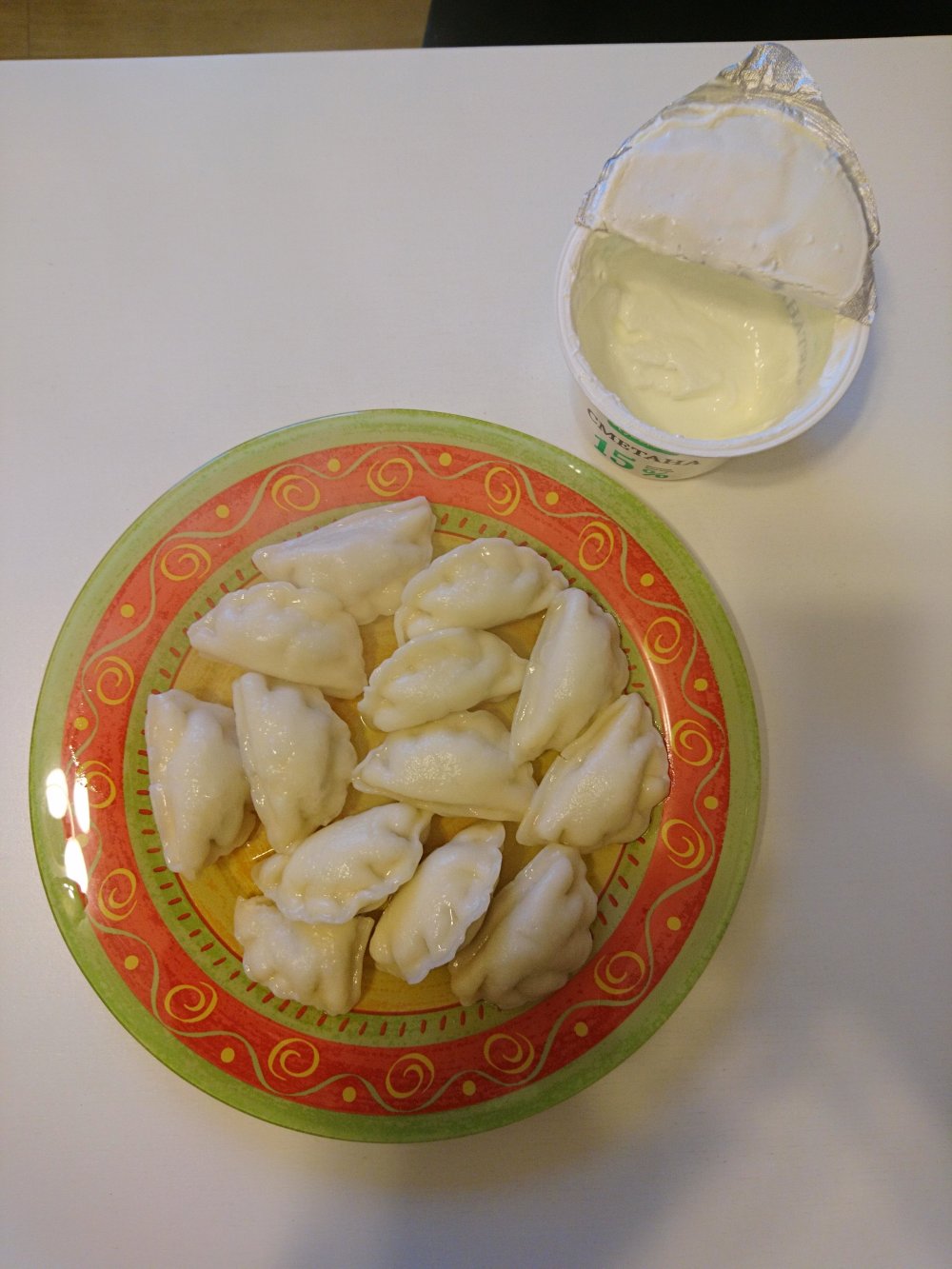 Vareniki… esta es otra de las elaboraciones rusas, y quizas algo mas peculiar… pasta pero rellena de otras cosas que no sean carne ( aunque tambien las hay con carne)… estas por ejemplo estan rellenas de patatas con setas (En MasterChef dirian que pasta con patatas??? hidratos con mas hidratos?…) Pues si…se rellenan de requeson, cerezas, col, setas…