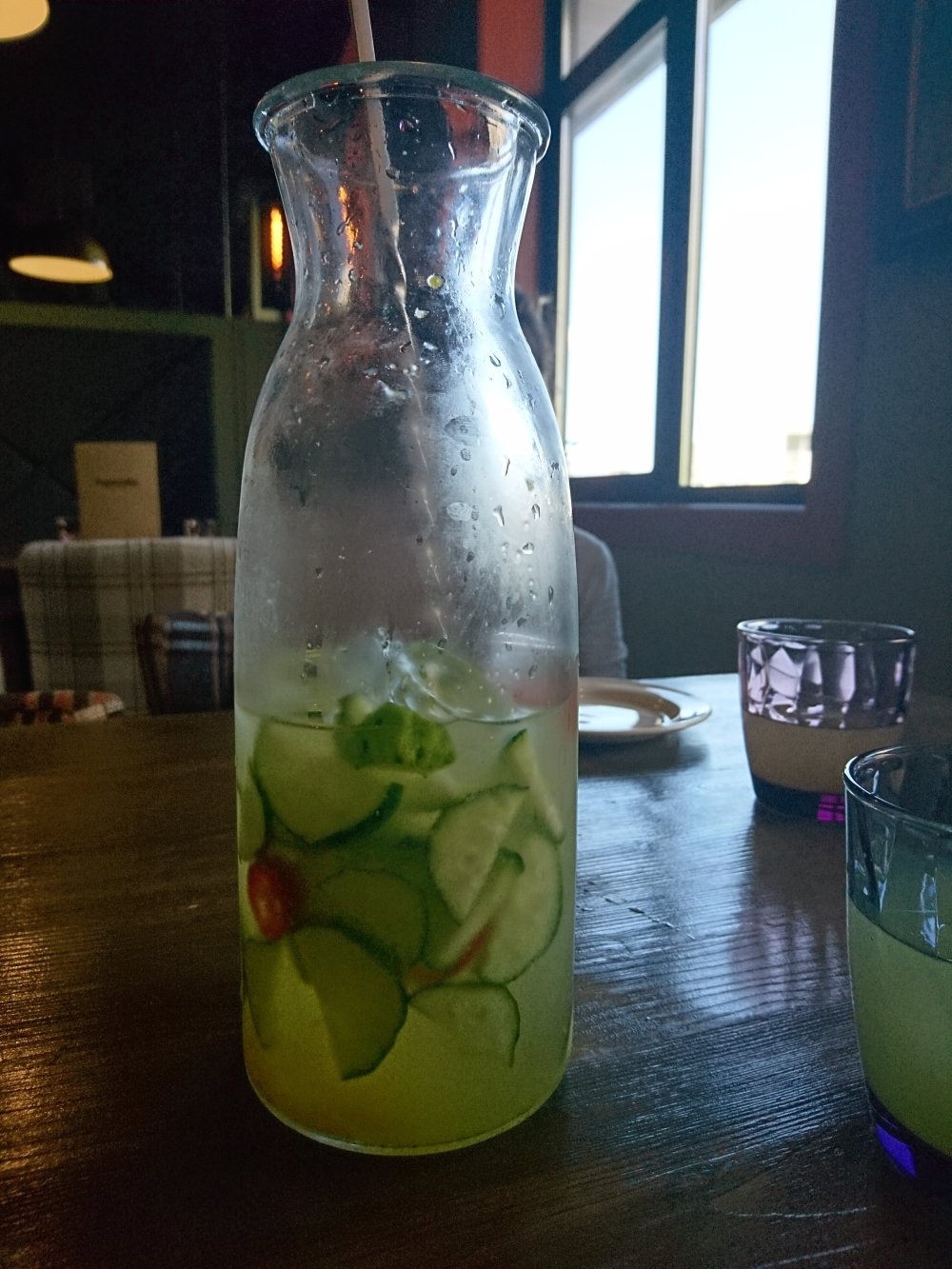 Seria como hacer una limonada normal, pero ademas se añaden rodajas, mas bien finas, de pepino fresco (despues de tanto tiempo aqui ya me he dado cuenta de que es la «verdura» que se come aqui de forma tradicional), ralladura de naranja y rodajitas de chile (fresco)… (yo creo que esta limonada tenia agua con gas, pero supongo que eso es opcional tambien)… Refresca por el limon y pepino y tiene un toque picante, pero agradable, no muy fuerte…