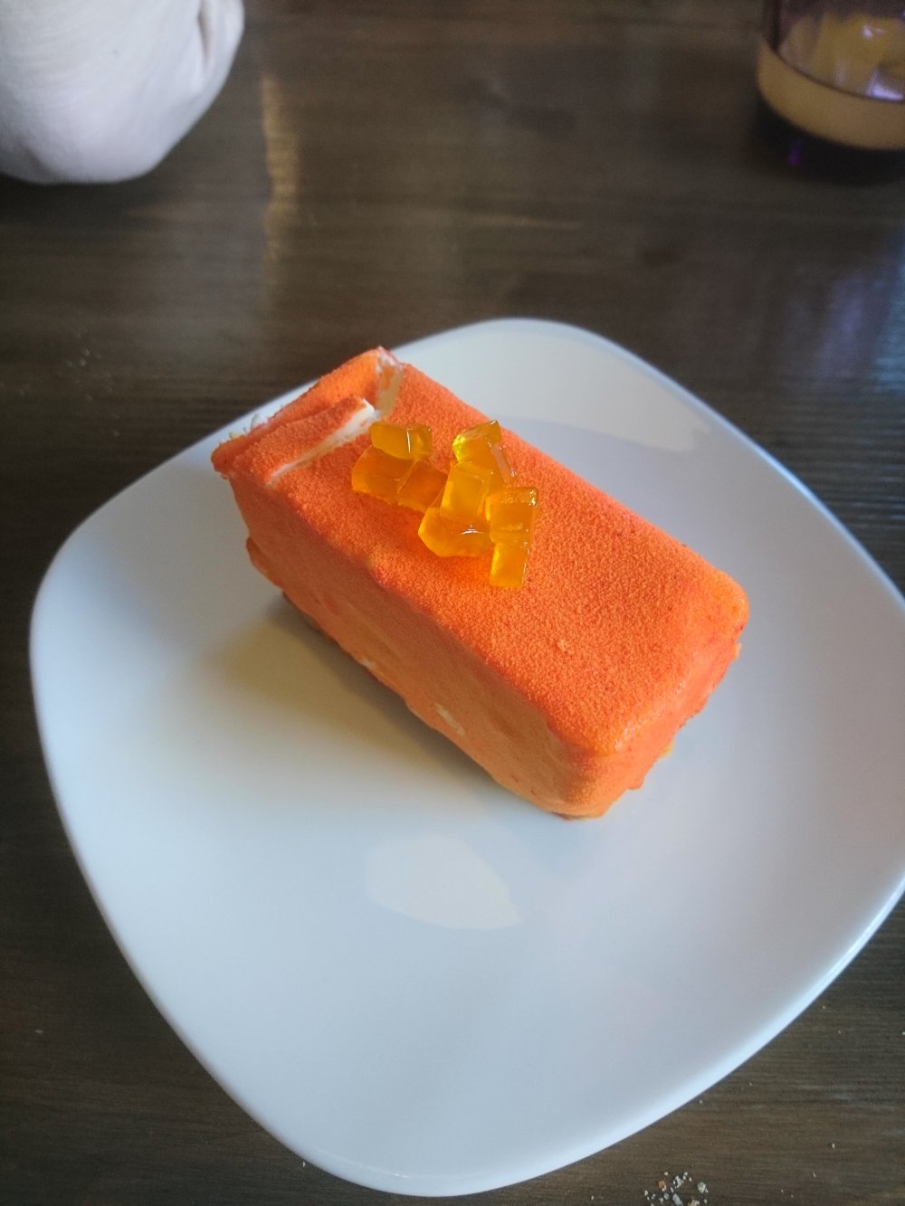 tiene una fina base de bizcocho con muchas nueces, el resto es mouse que queso con recubrimiento de mango, y esos trocitos son como gelatinillas de mango… un toque dulce (de estilo dulce ruso, que en realidad no es nada dulce, lo cual yo agradezco) y un poco acido… muy muy rico… (por cierto, aqui muchas tartas se venden ya preparadas en porciones, o sea, que pueden ser redondas, pero ya cada corte en cuña esta preparado para servir con un recubrimiento de plastico la porcion)…