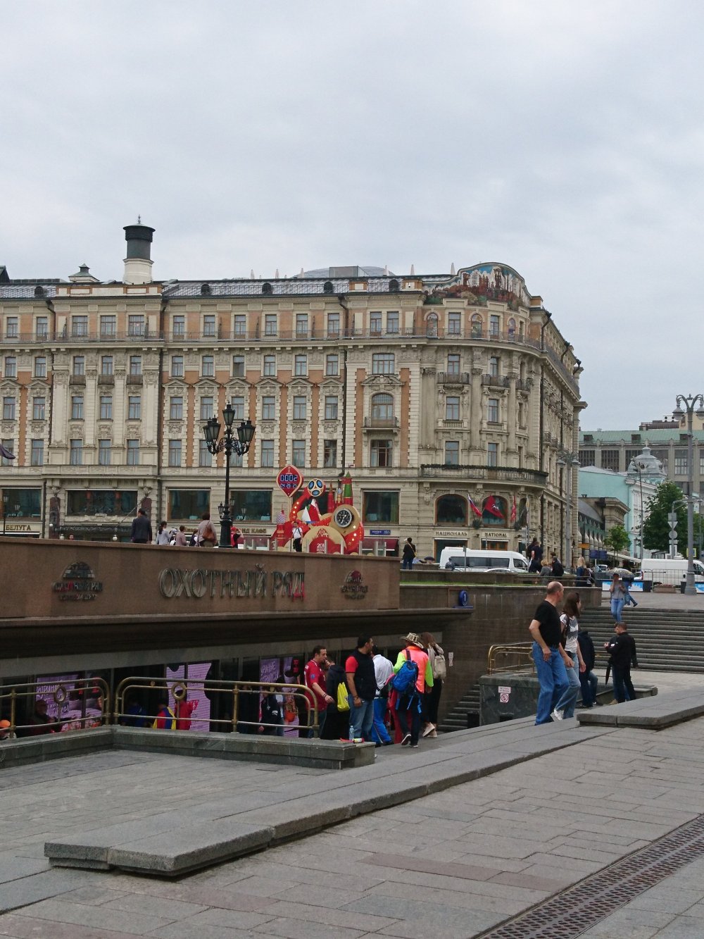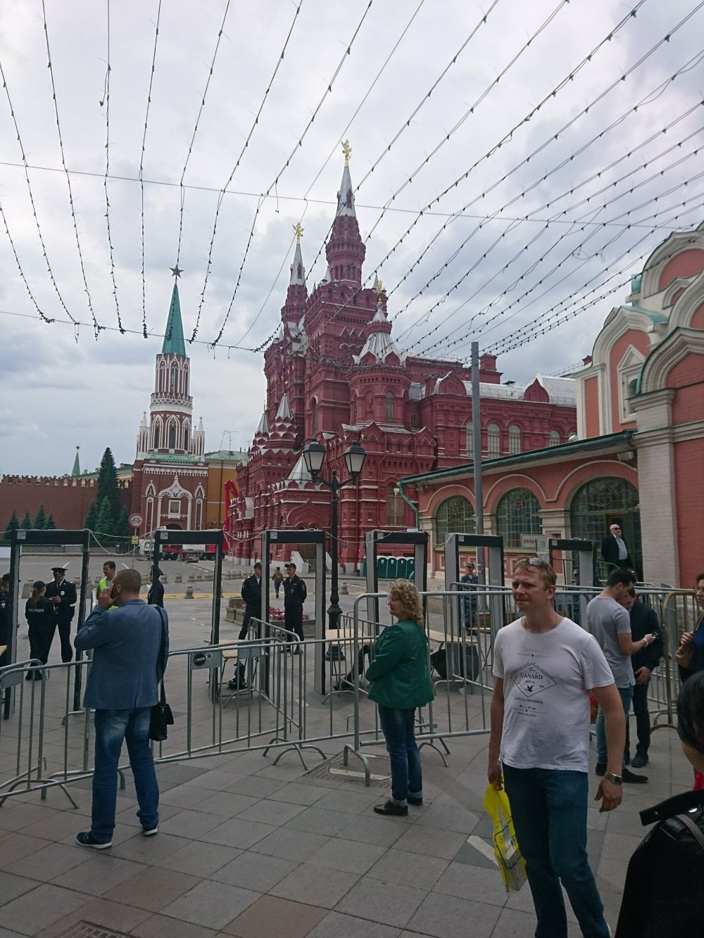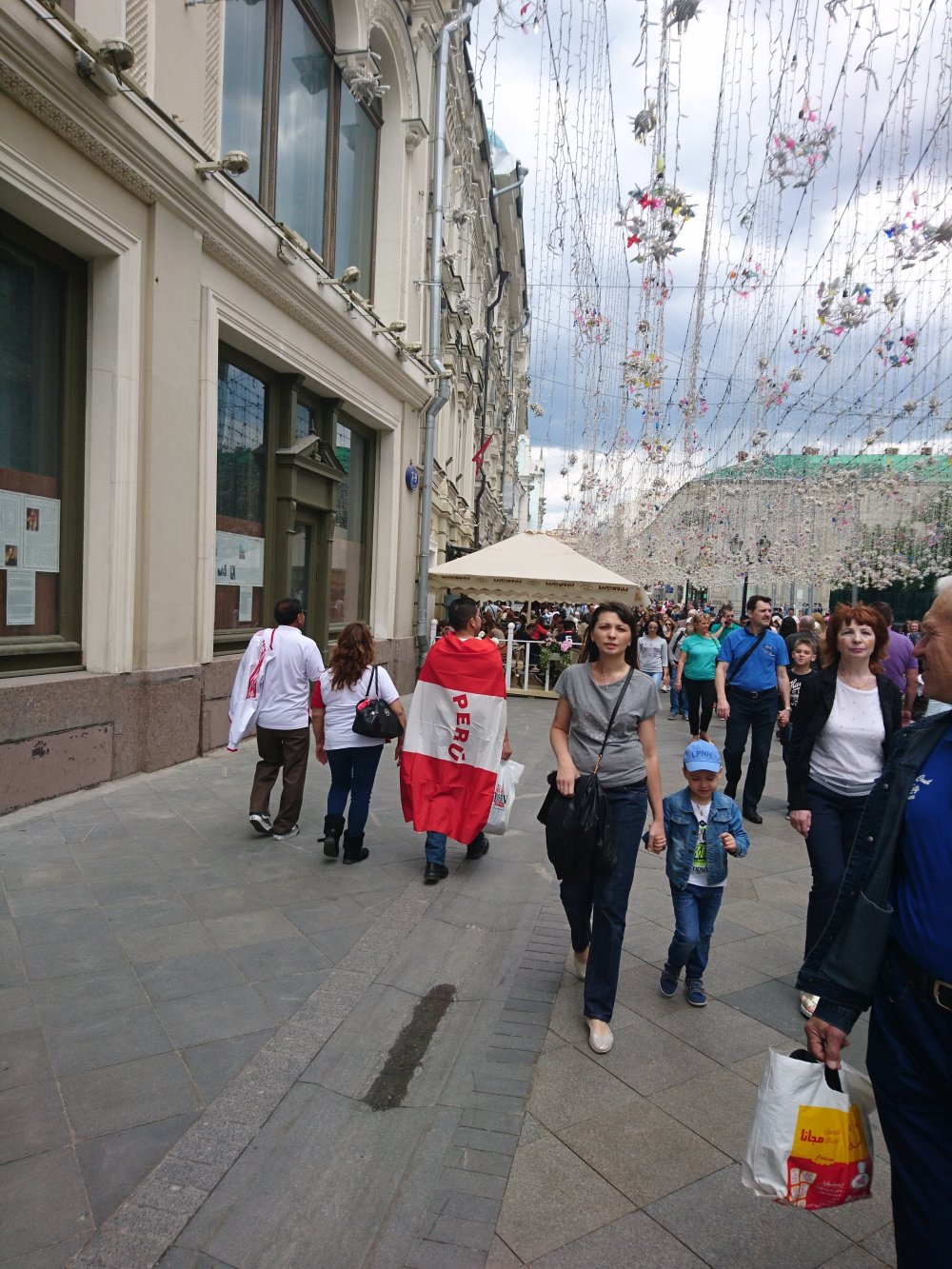 a dos (hoy 1) dia antes de empezar… a parte de que sale el sol, hace fresquete, llueve, hace calor, y hace aire, todo esto casi a la vez… (no exagero mucho… 😀 😀 😀) Es muy curioso mezclarse en el ambiente del centro de Moscu (alrededores de laPlaza Roja, porque en la misma no se puede pasar porque han montado una enorme pantalla y gradas) y ver la cara de sorpresa de los moscovitas y la de los fans haciendose fotos los unos con los otros… normalmente el ambiente es muy serio… ya sabeis la costumbre aqui es no sonreir, eso es de tontos y sin cabeza… pero ayer todo el mundo sonreia… menos la seleccion española… 😀 😀 😀 (… bueno, eso dicen las noticias, yo no vi muchos españoles)
