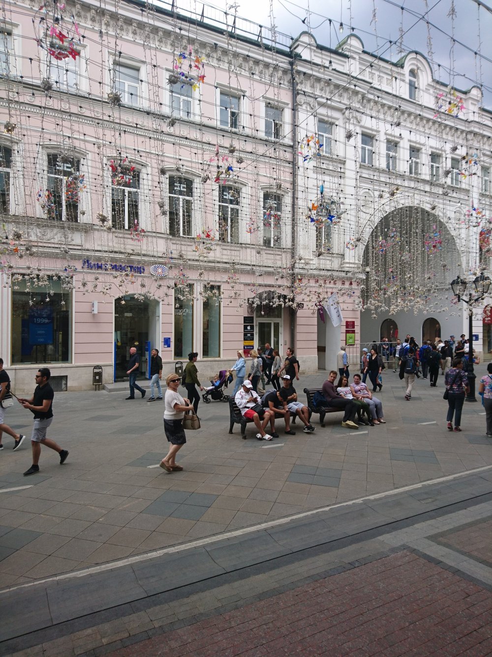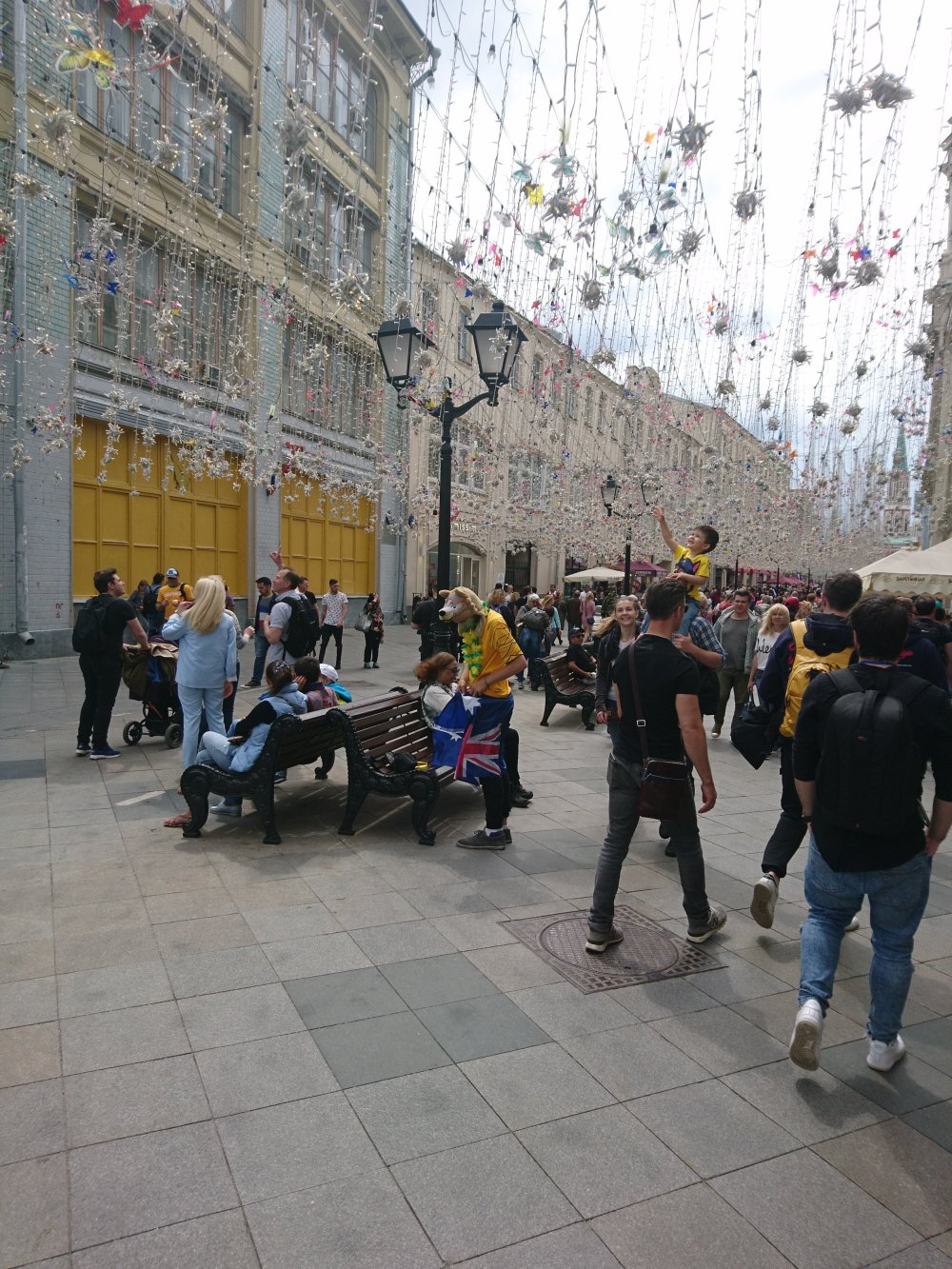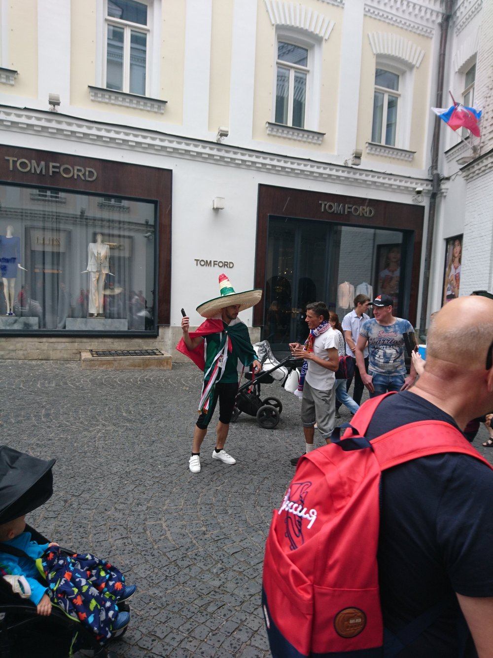 a dos (hoy 1) dia antes de empezar… a parte de que sale el sol, hace fresquete, llueve, hace calor, y hace aire, todo esto casi a la vez… (no exagero mucho… 😀 😀 😀) Es muy curioso mezclarse en el ambiente del centro de Moscu (alrededores de laPlaza Roja, porque en la misma no se puede pasar porque han montado una enorme pantalla y gradas) y ver la cara de sorpresa de los moscovitas y la de los fans haciendose fotos los unos con los otros… normalmente el ambiente es muy serio… ya sabeis la costumbre aqui es no sonreir, eso es de tontos y sin cabeza… pero ayer todo el mundo sonreia… menos la seleccion española… 😀 😀 😀 (… bueno, eso dicen las noticias, yo no vi muchos españoles)