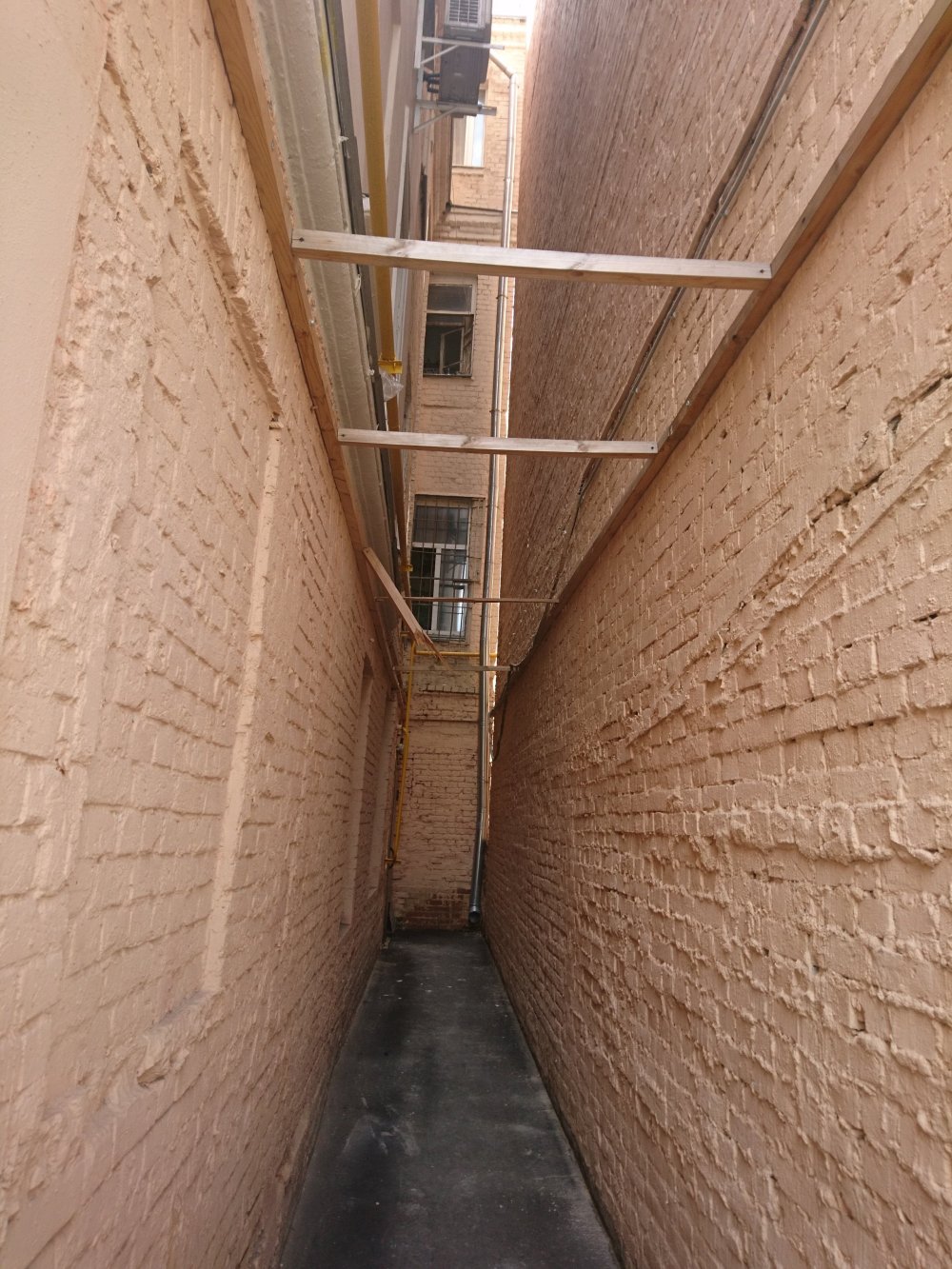Te respondo…Antes de cerrar el hueco ahi se metia la gente a hacer lo que le viniera en gana (realmente en gana). Segun uno esperaba a que otros terminasen, se le ocurrio «coño, voy a hacer una pintada…muellovsky», y a ese le sucedieron 14000 mas. Los vecinos tuvieron que apoquinar por salubridad, y ya que estaban pintaron. Un solo andamio para los dos lados y ya esta.