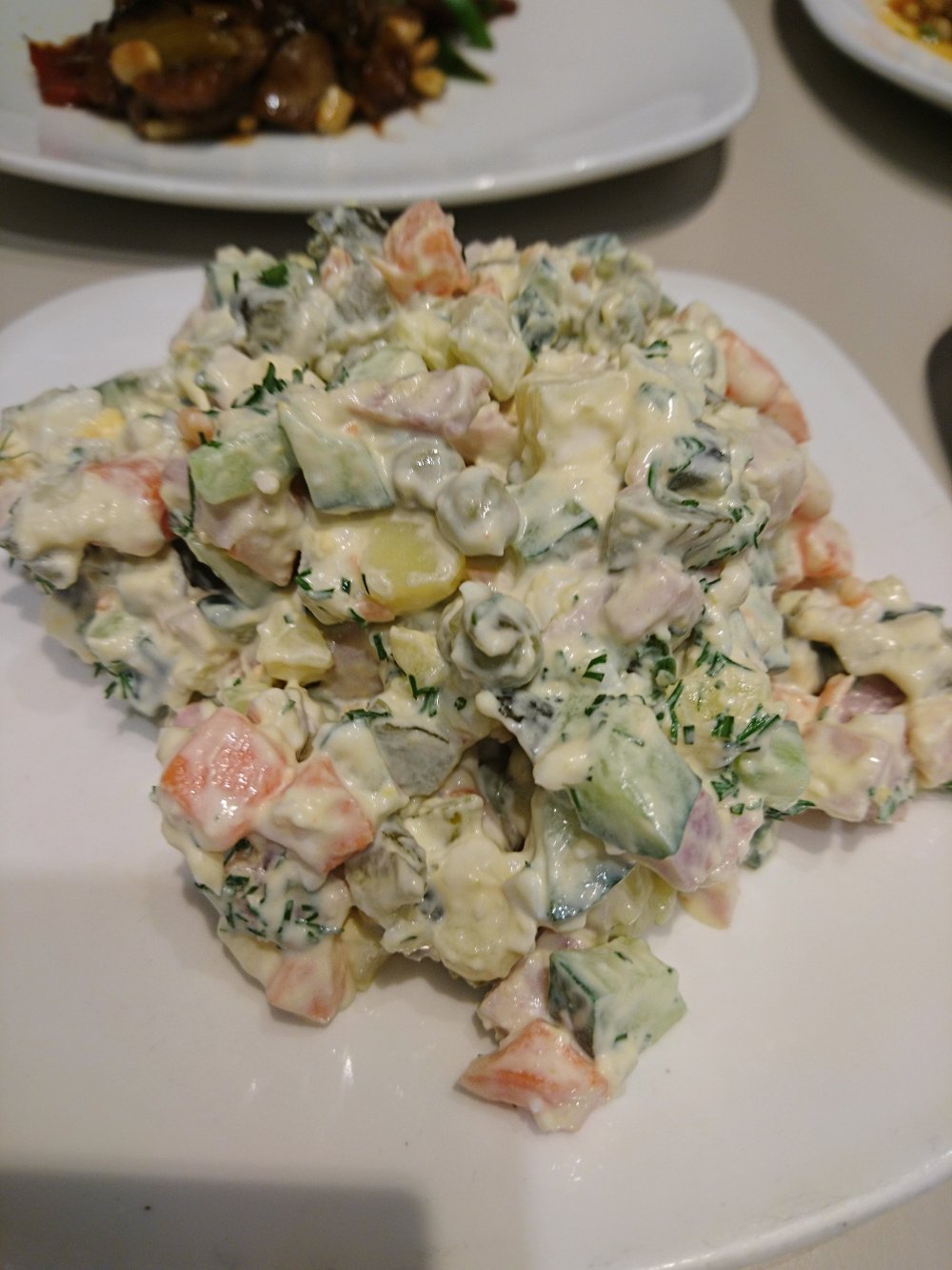 La Olivier… nuestra ensaladilla de aqui, o sea Rusa… como veis, el pepino fresco…