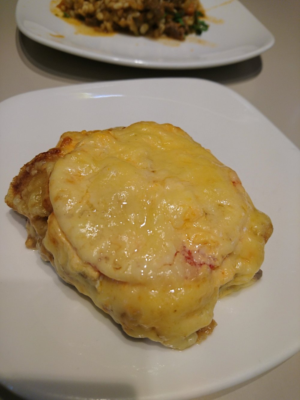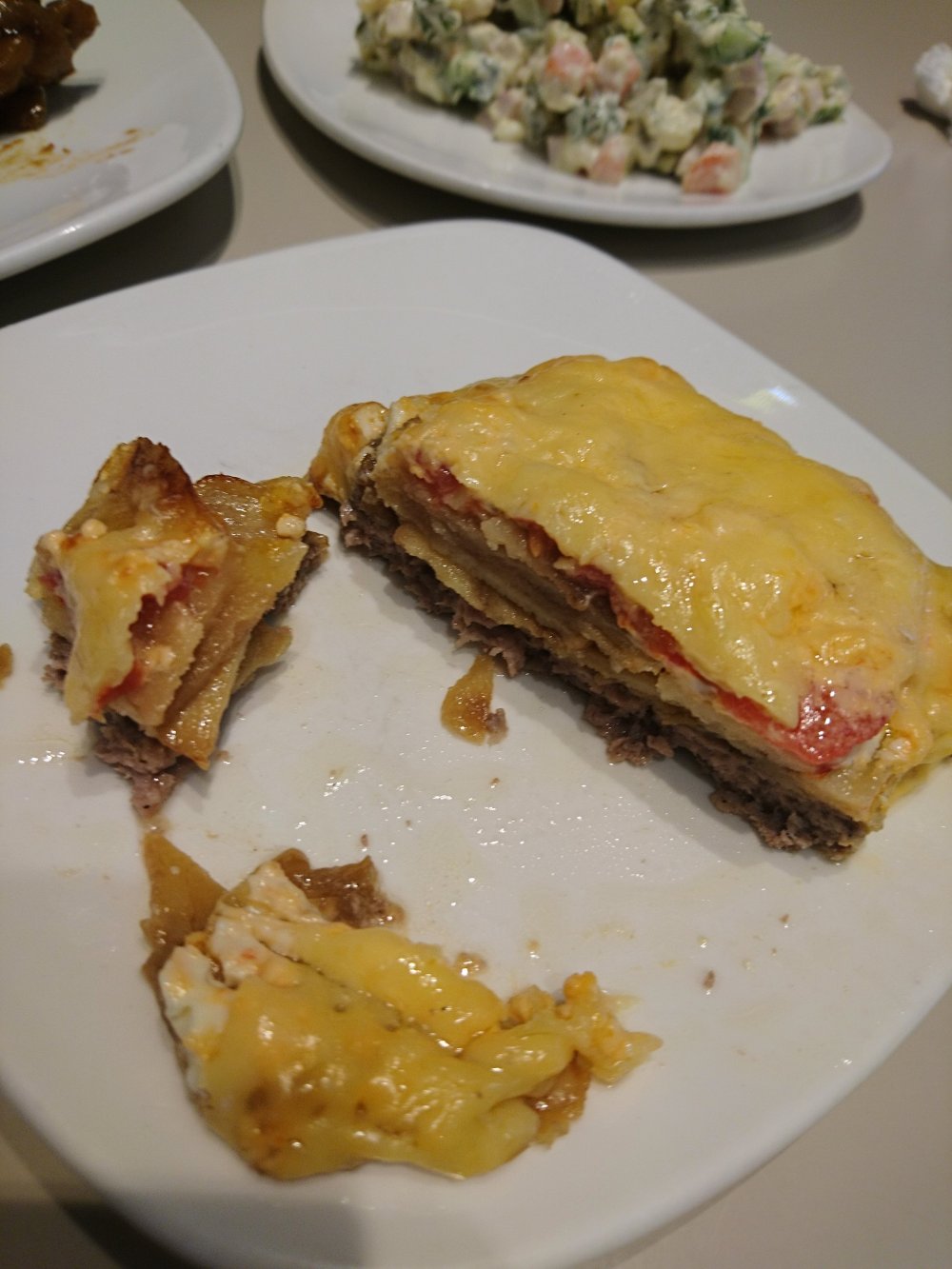 y este es uno de los mas habituales en cada casa rusa… escalope de ternera, patatas cortadas en rodajas muy finas, una capita de mahonesa, tomate, y queso… y todo eso al horno… claro, se llena de bandeja del horno con estas porciones… y el resultado esta muy muy rico…