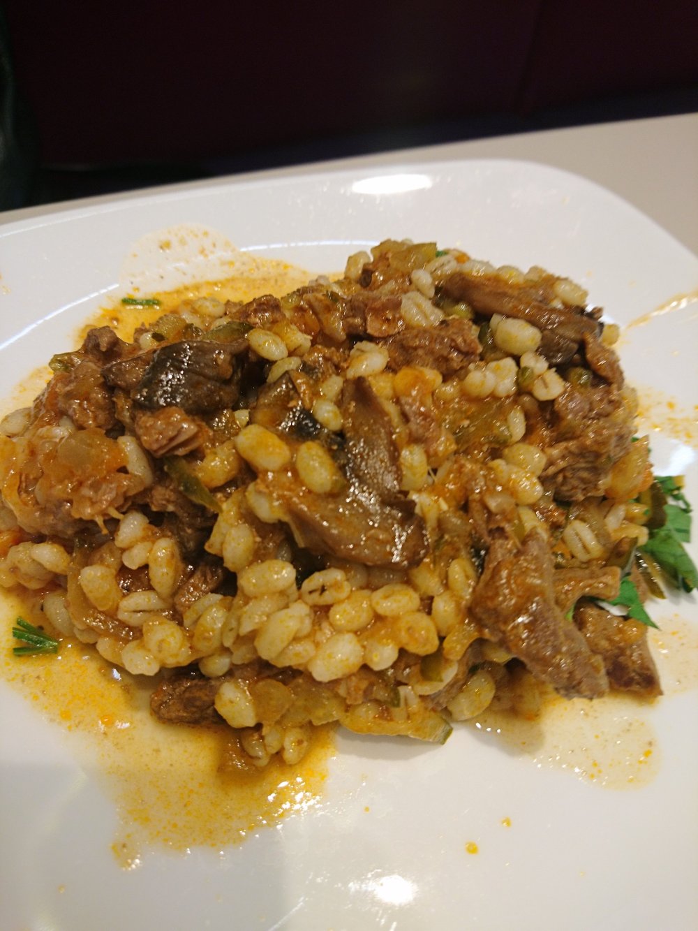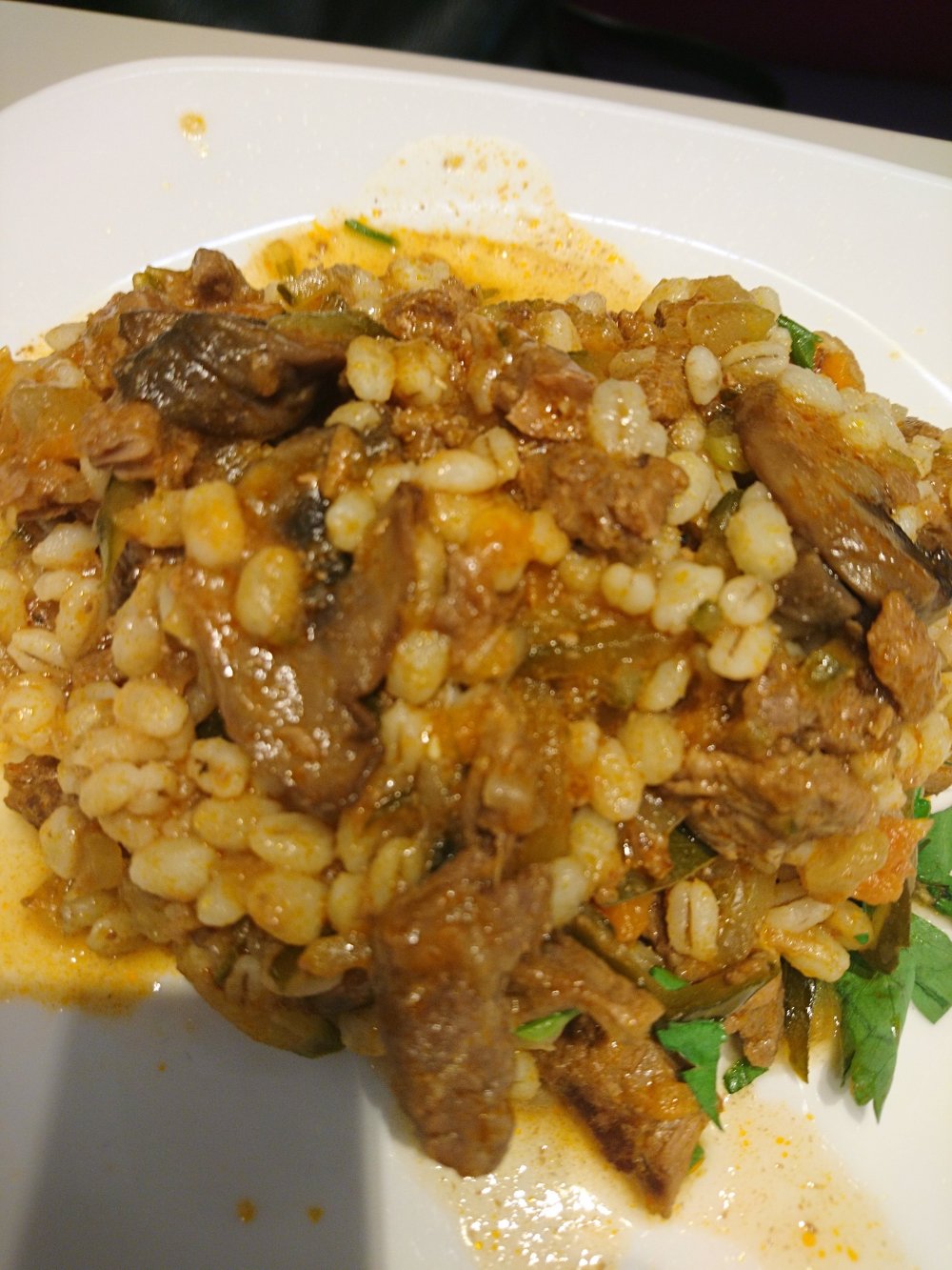 esto tambien es muy de aqui… cebada perlada con ternera al stroganoff… la verdad es que la cebada por si sola es muy sosa, y se usa mas para hacer especie de risottos, solo que tarda como 40 minutos… esta muy rico…