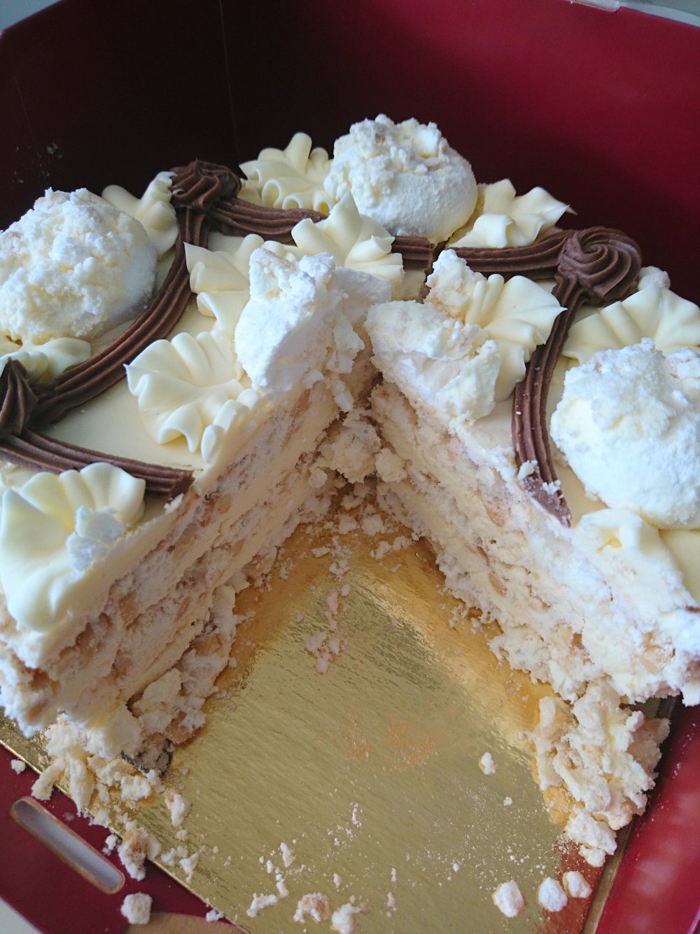 Es una de las 12 tartas de la epoca sovietica… como ya he dicho muchas veces las tartas rusas no tienen bizcocho, y esta vez tiene capas de merengue con trocitos de cacahuete mezclados en la masa y horneado como 2 horas hasta que queda crujiente, y despues se usa crema de mantequilla y azucar (despues de otra larga elaboracion, no es solo mezclar)… y despues de muchas horas de trabajo tienes una tarta no muy dulce, pero comparada con las tartas de aqui, quizas la que mas… crujiente, y muy muy rica…