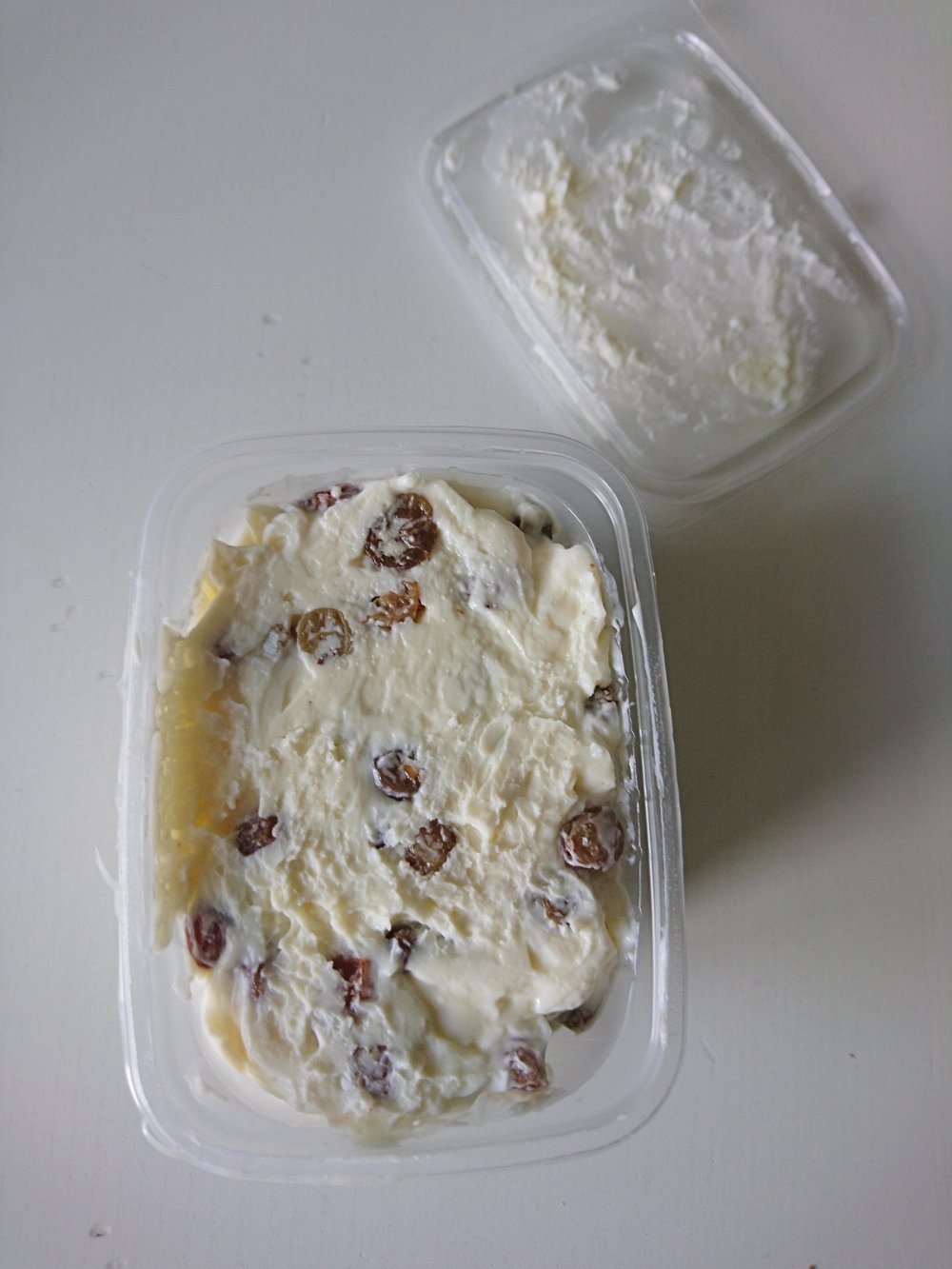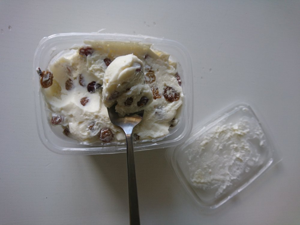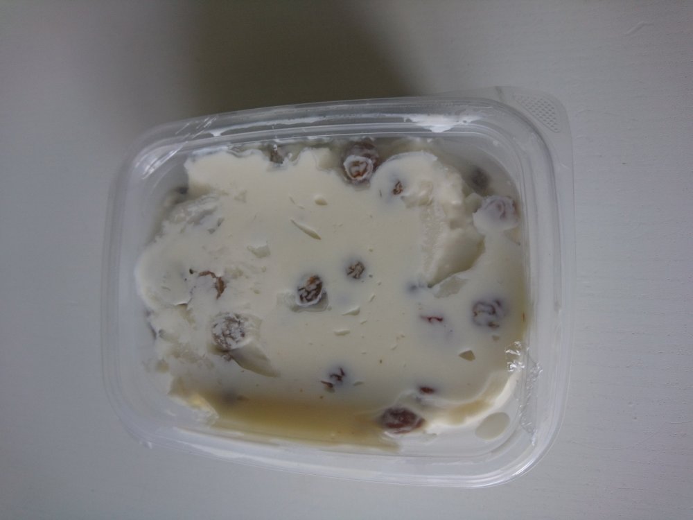 Masa de Requeson… con pasas… os acordais del Sirok? unas barritas tipicas de aqui de requeson con dulce de leche, o chocolate? pues esta es la masa y de puede comprar al peso… parece un helado, pero ni se parece… requeson, mantequilla, azucar, pasas, y vainilla…